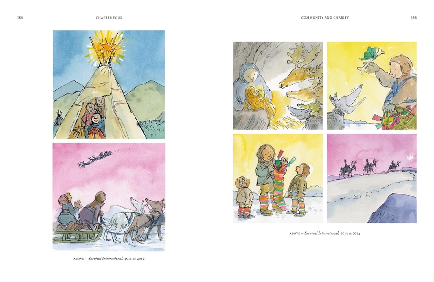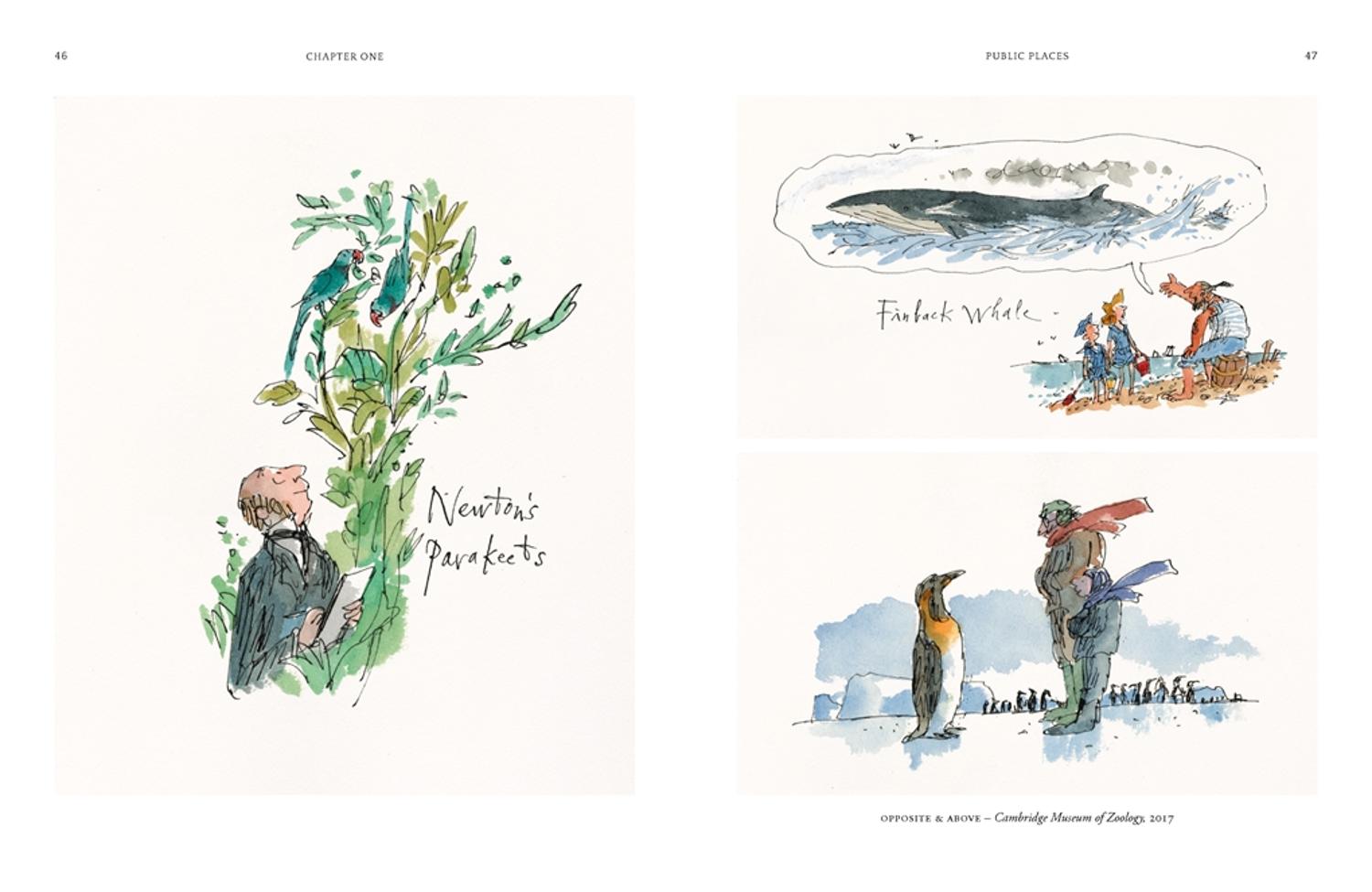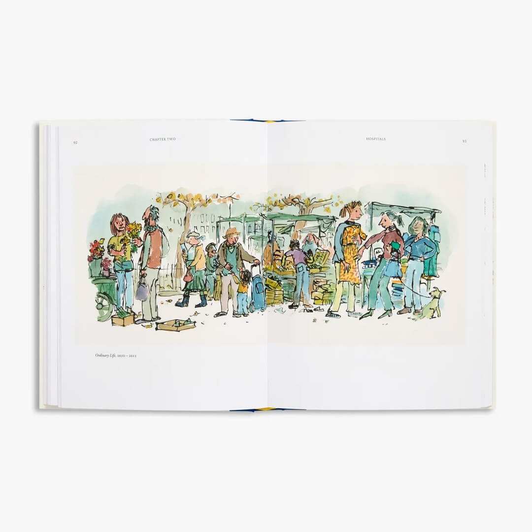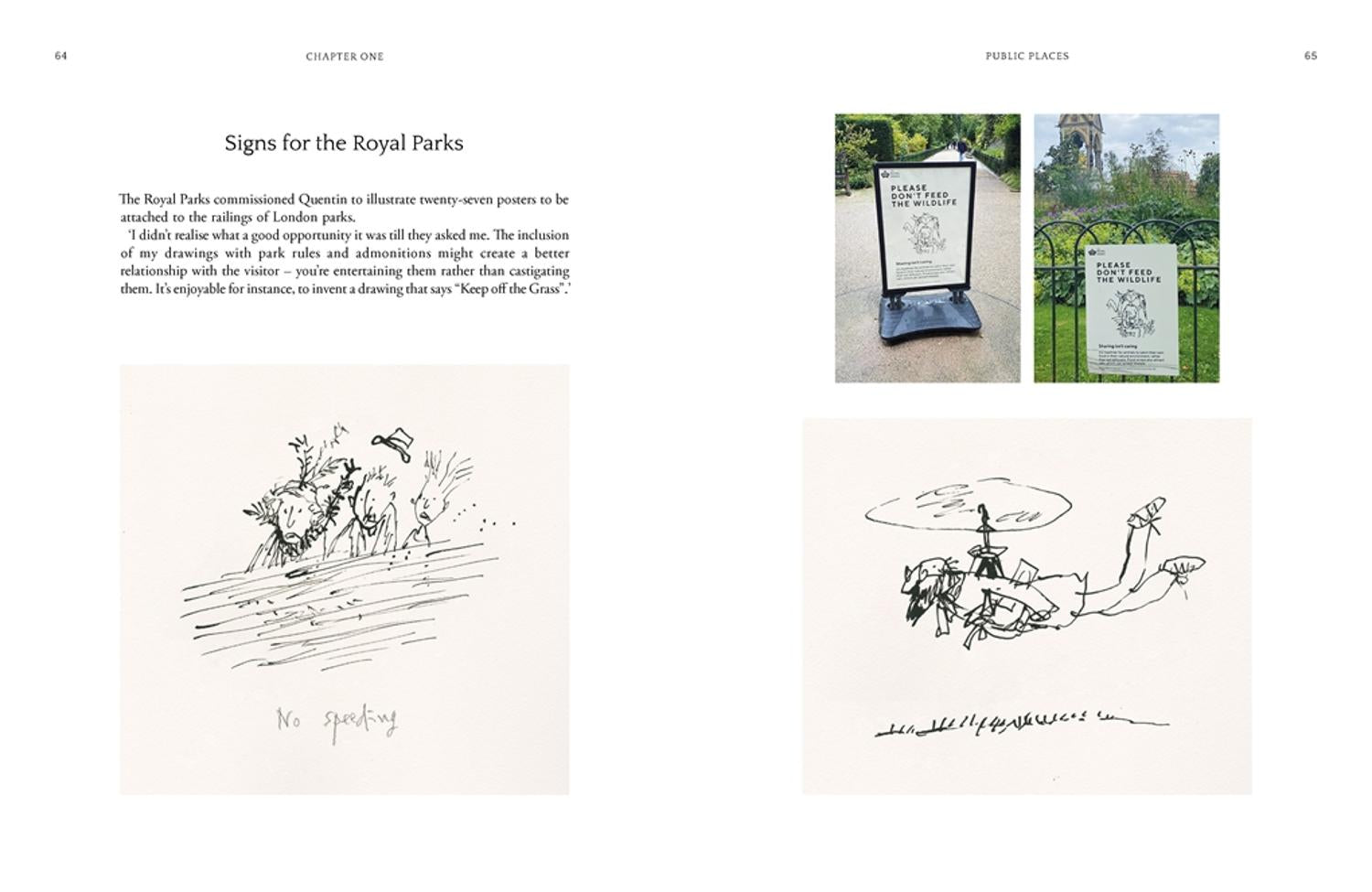 El trabajo que se presenta aquí muestra a Quentin utilizando este lenguaje con gran efectividad y para propósitos muy distintos. En 2007, cuando Isabel II inauguraba el nuevo Eurostar en St Pancras, se le pidió a Quentin que ocultara un edificio poco atractivo al otro lado de la calle. Él dibujó una ilustración a dos colores en su mesa de dibujo mostrando un elenco de personajes que uno podría encontrar en una calle de Londres; luego se amplió lo suficiente como para envolver un edificio de cinco pisos.